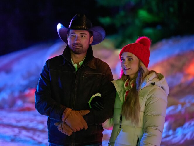 Meanwhile, the town of Big Sky Ridge becomes a vibrant supporting character, filled with colorful residents who embody the film’s central theme of community. From the wise and witty innkeeper (Jennifer Coolidge) who gives Claire advice on love, to the local sheriff (Wes Brown) who has his own holiday crush, every character contributes to the warm, interconnected tapestry of small-town life. The cinematography captures the sweeping beauty of Montana — snow-covered peaks, glowing log cabins, and starlit nights that feel like pure Christmas magic.